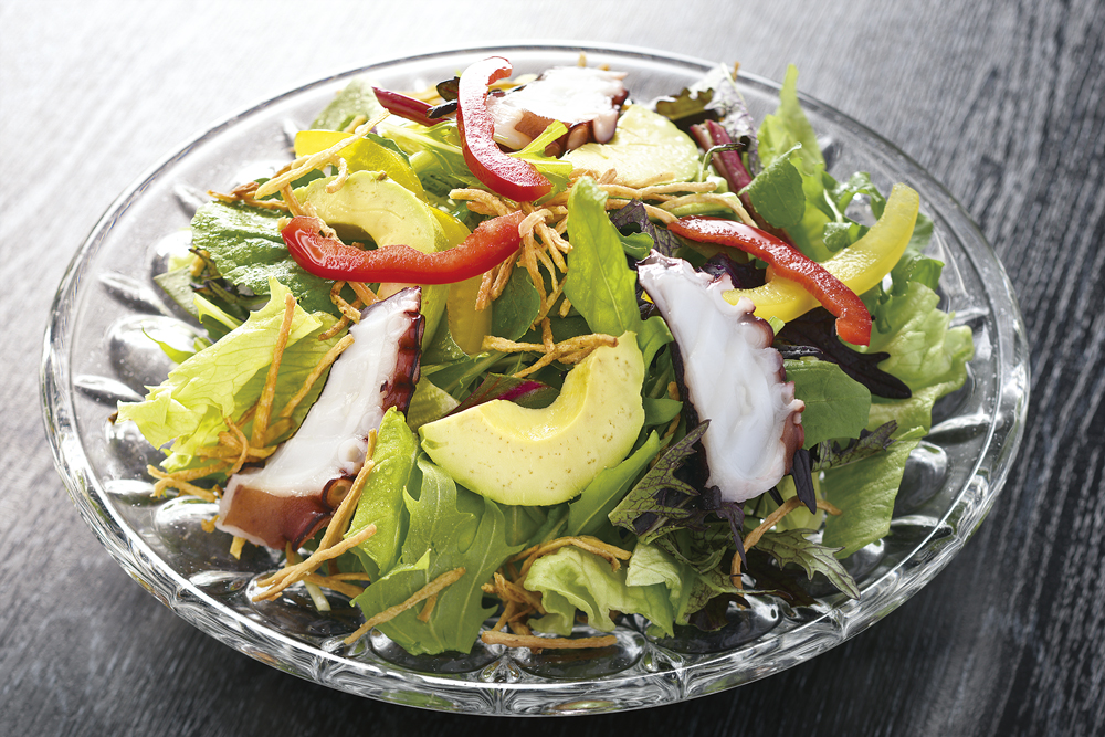 採れたて葉野菜と瀬戸内産のタコを使ったサラダです。