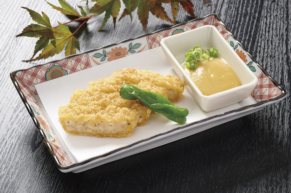 白身魚や瀬戸内のイワシなどの魚のすり身にパン粉を付けて揚げています。たこ入りで酔心オリジナル。
