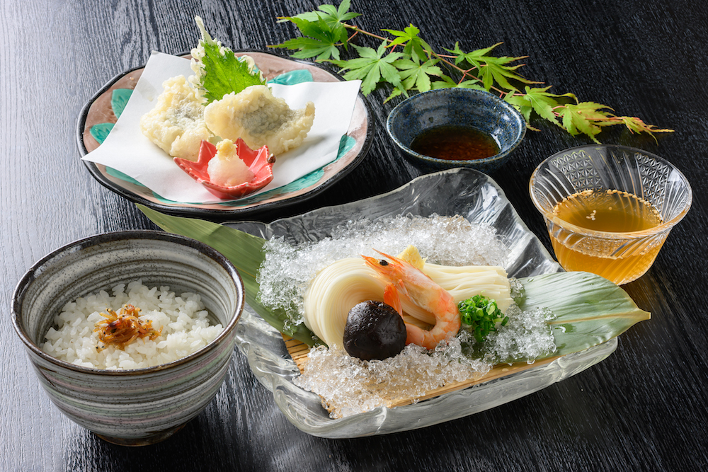 ・冷やしそうめん・国産穴子天ぷら・山椒ちりめんご飯