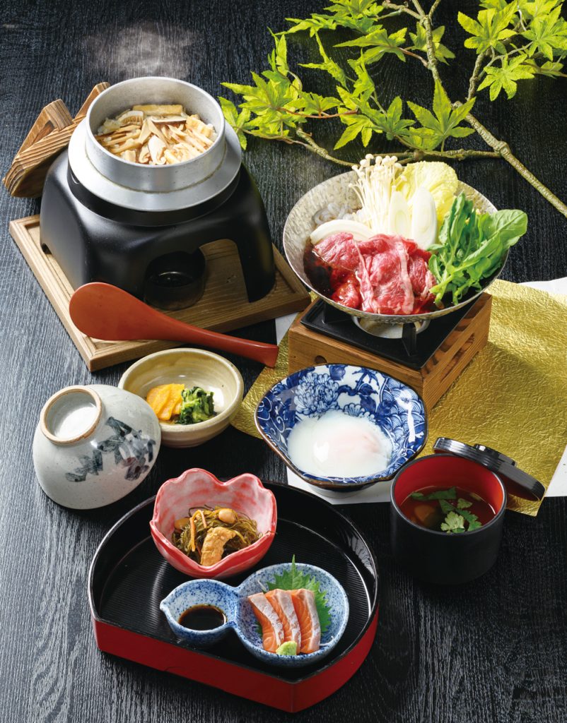 香り高い松茸釜飯と、旨みたっぷりの和牛すき焼きをセットにした御膳は、