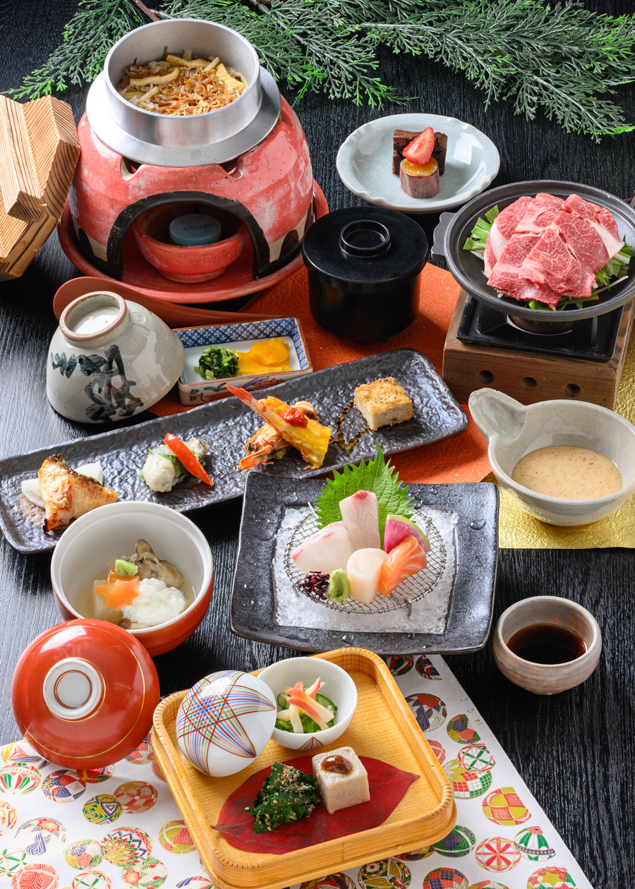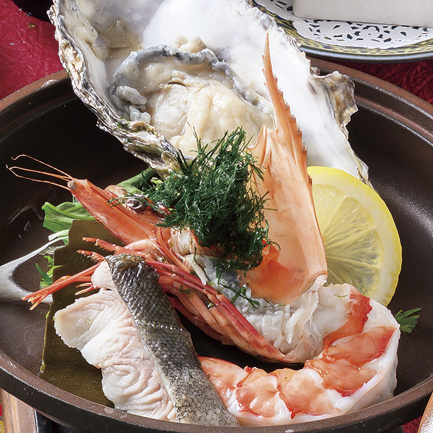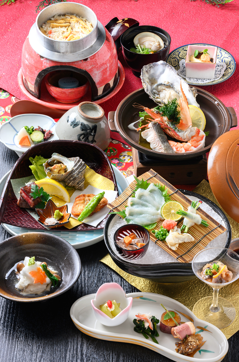 | [前菜]音戸ちりめんおろし和え 広島県産牡蠣しぐれ煮 ふぐ皮煮こごり 菜葉の胡麻和え [向付]長崎産とらふぐ刺し 鮮魚二種盛合わせ [鍋物]国産和牛すき焼き 温玉 [焼物]ロブスター二色焼き 〜かに味噌・ガーリックバター 野菜ピクルス添え〜 [飯物]音戸ちりめん釜飯 吸物 漬物 |