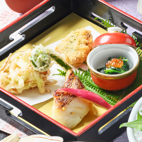 | [先付]筍木ノ芽和え ホタルイカの酢物 桜豆腐 [向付]愛媛県産鯛の松皮造り 生マグロ 赤貝 瀬戸内産サヨリ浅月巻 [煮物]蕗 筍 椎茸 はまぐりの黄身煮 [強肴]国産牛ステーキ 芽キャベツ パプリカ 玉ねぎスライス 〜オニオンドレッシング〜 [焼物・揚物]愛媛県産鯛の西京焼き 桜海老かき揚げ 六穀豚梅大葉巻揚げ 青葉浸し [飯物]あさり山菜釜飯 吸物 漬物 [果物]イチゴのババロア 〜追加料金で釜飯の内容を変更できます〜 ◯ホタルイカ...500円[3月] ◯愛媛県産鯛...700円[3〜4月] ◯筍と蛤...1,000円[4月] ◯広島県産牡蠣...1,000円 ◯国産穴子...1,500円 ◯天然有頭赤えび...700円 |