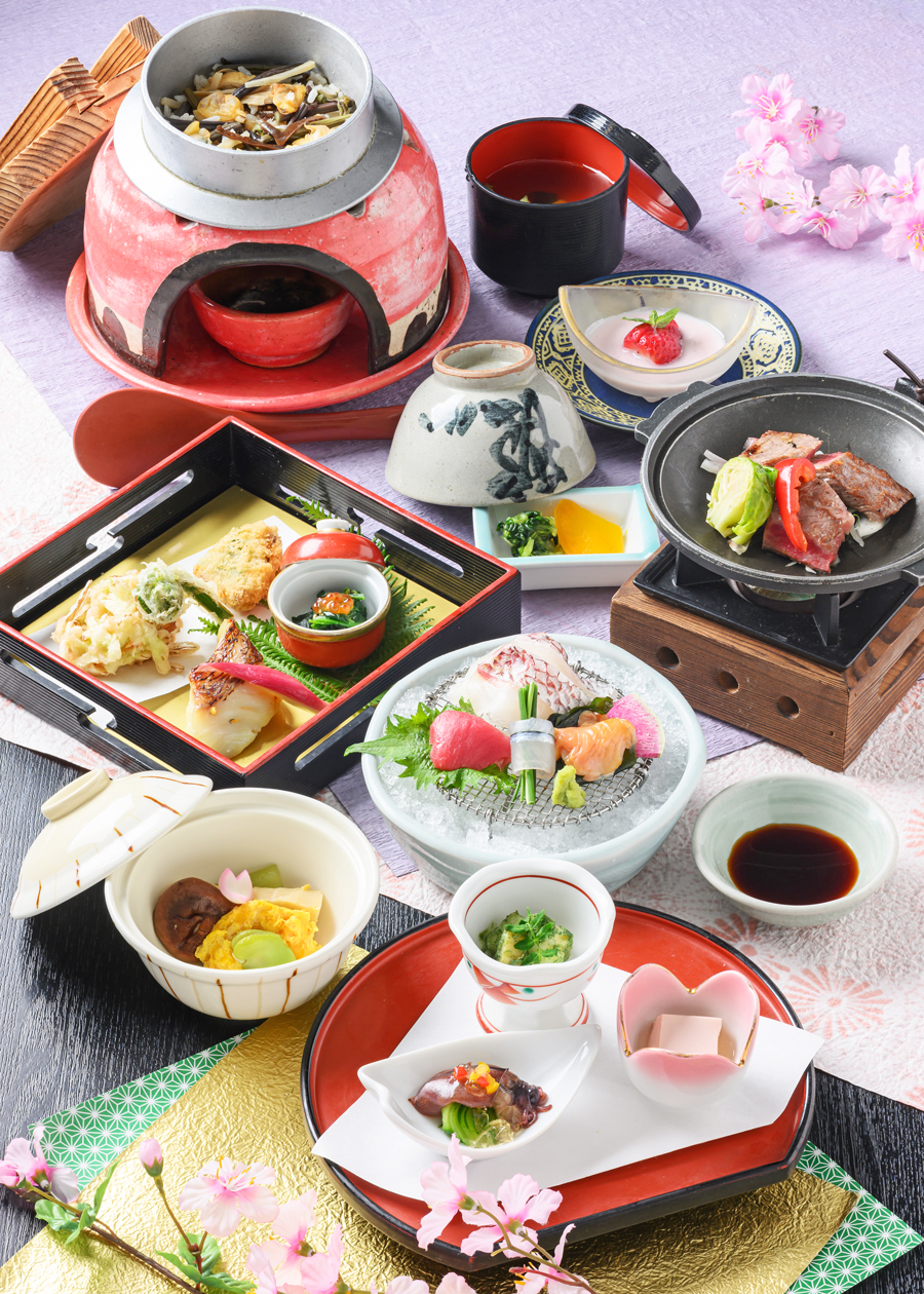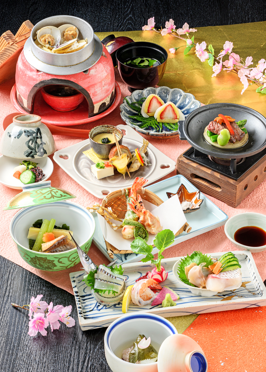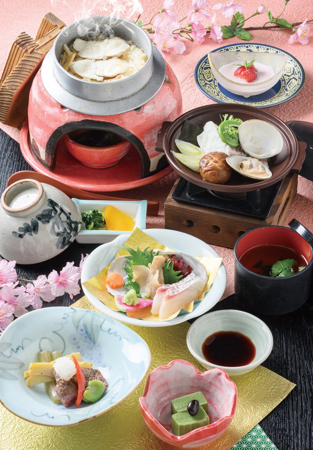 | [前菜] フカヒレ茶碗蒸し 〜ランプフィッシュキャビアのせ〜 とらふぐ白子豆腐 穴子の鳴門巻 ワカサギマリネ あわび含め煮串刺し [向付] 瀬戸内産サヨリ 生海老湯引き 島根産白ミル貝 鯛の松皮造り [煮物] 青森産メバル煮付け ~ワカメ・筍・蕗・桜人参~ [焼物] 生ウニのせ和牛モモステーキ ~彩り野菜添え~ [揚物] 車海老の大葉巻天ぷら こごみ ~蒲刈産藻塩にて~ [蒸物] 真鯛と赤飯の桜葉蒸し ~わさび餡かけ~ [飯物] 国産筍と蛤の釜飯・吸い物・香の物5種 [デザート] 苺きんとん大福 |