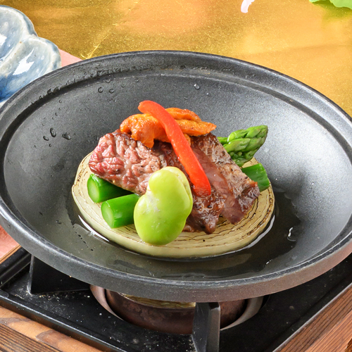 | [ 小鉢 ] よもぎ豆腐 [ 刺身 ] 愛媛県産鯛松皮造り 白ミル貝 [ 焼物 ] 国産牛ステーキ 筍とフキ油いため [ 蒸物 ] 愛媛県産鯛と蛤酒塩蒸し [ 飯物 ] 愛媛県産鯛釜飯 吸い物 漬物 [ デザート ] 苺の豆乳ババロア |